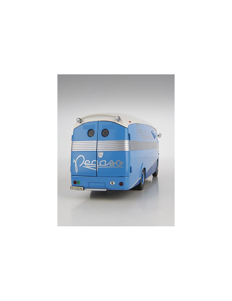 Aunque su nombre oficial era furgón Pegaso Diésel Z-902, este vehículo pasó a la historia con el apelativo de “Bacalao” debido a unas singulares entradas de aire laterales, con aspecto de aletas de pez, que destacaban en su carrocería. Estos elementos eran una parte más de una envoltura de gran originalidad que se caracterizaba también por su diseño fusiforme, un rasgo que mejoraba su aerodinámica y la conducción central, en una cabina con un parabrisas compuesto de tres segmentos. La mecánica era bastante tradicional considerando que el chasis era derivado de los modelos para autobús y el motor era la conocida unidad Diésel de 140 CV montado en la segunda generación del Pegaso Z-202. Destacaba la conducción central y la cabina muy alta y de suelo completamente plano. Dimensiones: 2.5cm ancho, 10cm largo, 3.5 alto, escala 1:43. La única unidad construida en die cast del Bacalao fue utilizada como vehículo de asistencia para el transporte de los deportivos Pegaso Z-102.
